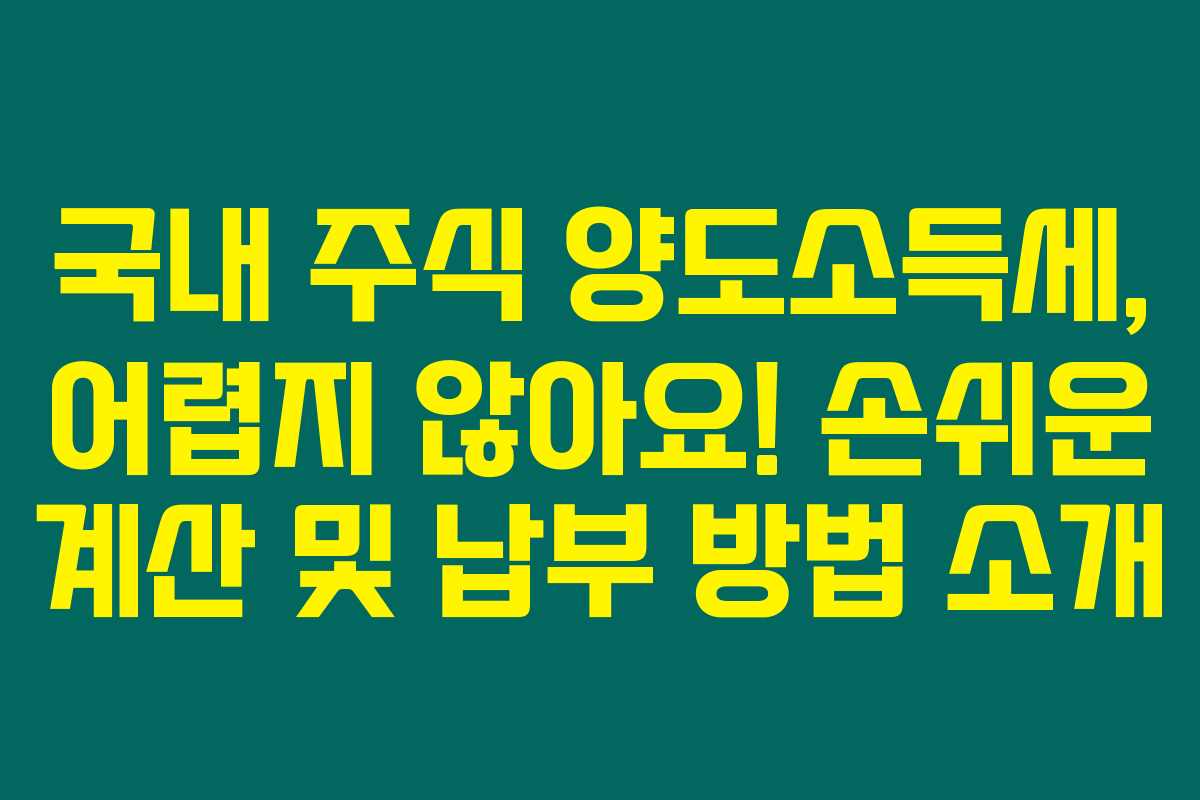 제가 직접 경험해본 결과, 국내 주식 양도소득세와 관련된 정보를 정리해 드리려고 해요. 주식을 거래하며 겪을 수 있는 양도소득세 계산 방법과 납부 방법을 자세히 안내드릴게요. 주식 매매를 하실 때 꼭 알아두셔야 할 내용을 함께 확인해 보세요.