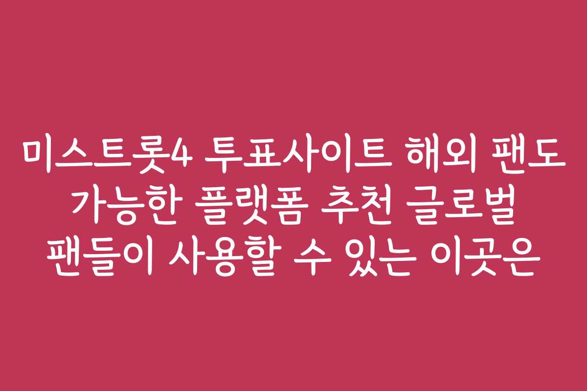 글로벌 팬들이 미스트롯4에 참여하고 싶지만, 투표 사이트에 접근하는 것이 어려운 경우가 많습니다. 이렇게 해외에 있는 팬들을 위해 유용한 투표 플랫폼을 소개합니다. 이 글에서는 미스트롯4에 참여할 수 있는 쉽고 간편한 사이트를 추천하니, 놓치지 마세요!