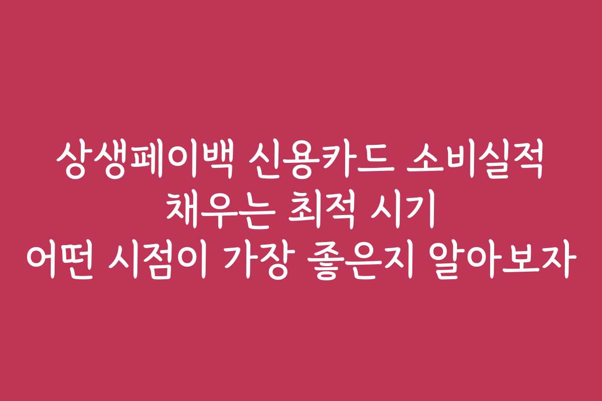 상생페이백 신용카드를 사용하려는 많은 소비자들이 항상 고민하는 질문이 있습니다. ‘소비실적을 채우기 가장 좋은 시점은 언제일까?’ 본 포스트에서는 상생페이백 신용카드를 최대한 활용하기 위한 최적의 소비 시기에 대해 구체적으로 알아보겠습니다.